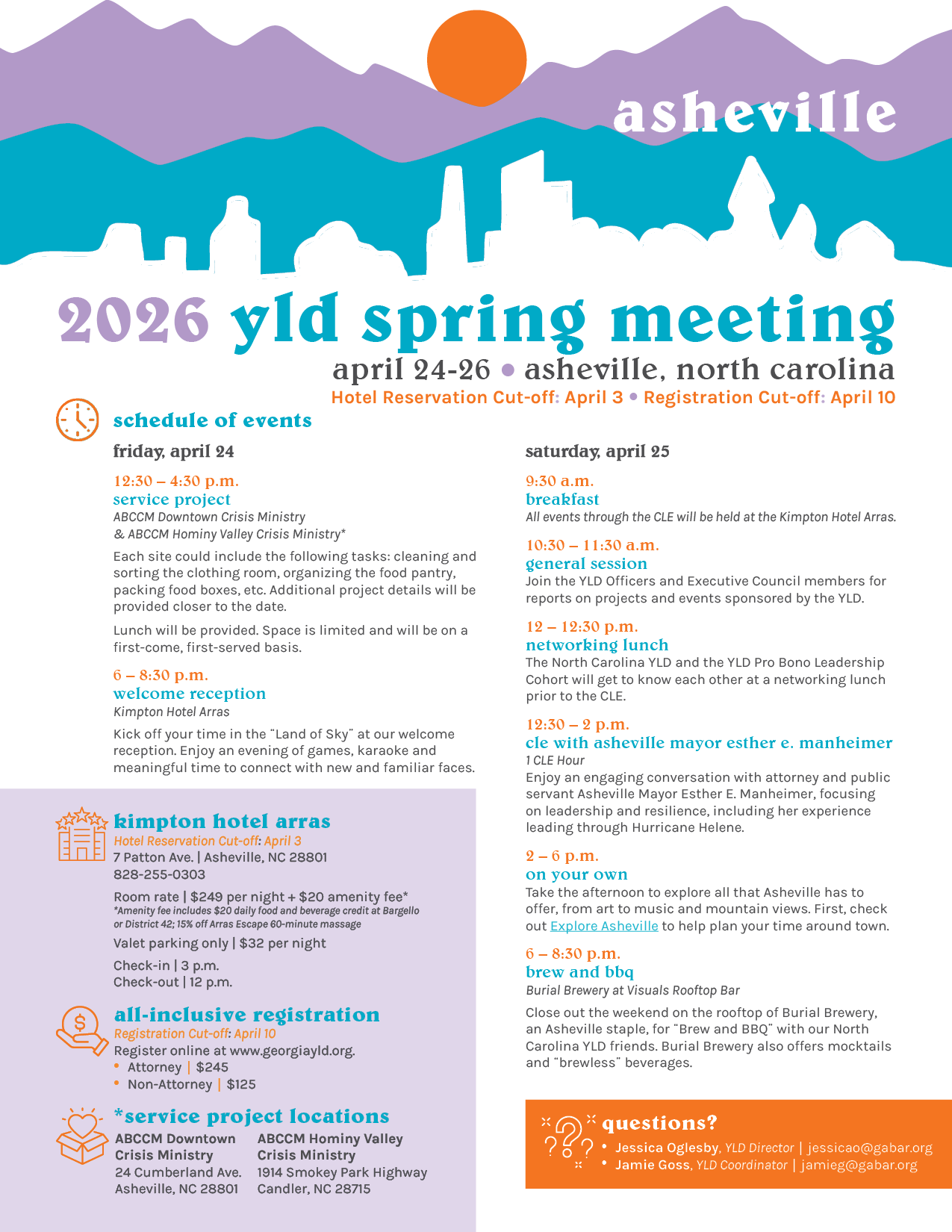 Join the YLD at their Spring Meeting on April 24-26 at the Kimpton Hotel Arras in Asheville, North Carolina. The discounted room rate is $249 per night, plus a daily $20 amenity fee and applicable taxes. (The amenity fee includes a daily $20 food and beverage credit at Bargello or District 42, and 15% off the Arras Escape 60-minute massage.) Click here to make your hotel reservation online. The cut-off is April 3.
